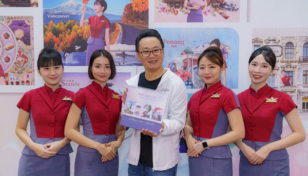 ▲華航總經理陳漢銘親臨旅展與制服人員合影留念,推廣2026年唯美桌曆。