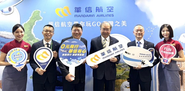 ▲(左2起)華信航空總經理莊明哲、董事長陳大鈞、中華航空董事長高星潢、資深副總經理張程皓與華信航空空姐合影。