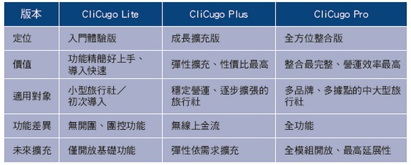 3種CliCugo版本讓旅行社各取所需長川資訊推出CliCugo系統區分為Lite(入門)、Plus(成長)、Pro(全方位)3種版本,顯示其針對不同規模旅行社提供精準轉型工具的策略。