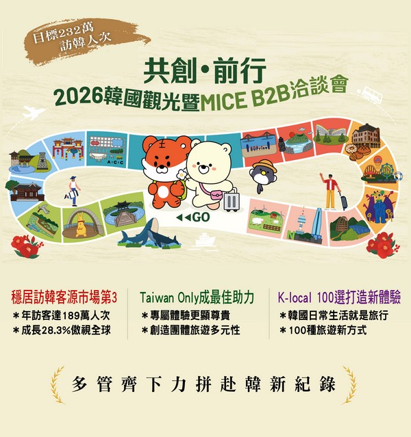 隨著訪韓熱潮的延燒,為加速台灣市場推廣韓國旅遊商品,韓國觀光公社台北支社於3/19假台北萬豪酒店舉辦「共創.前行2026韓國觀光暨MICE B2B洽談會」,邀請42家韓方業者與台灣旅行業者進行面對面的交流洽談,深入挖掘雙邊市場需求,期盼攜手創造更多韓國優質旅遊商品。