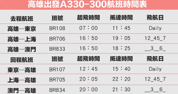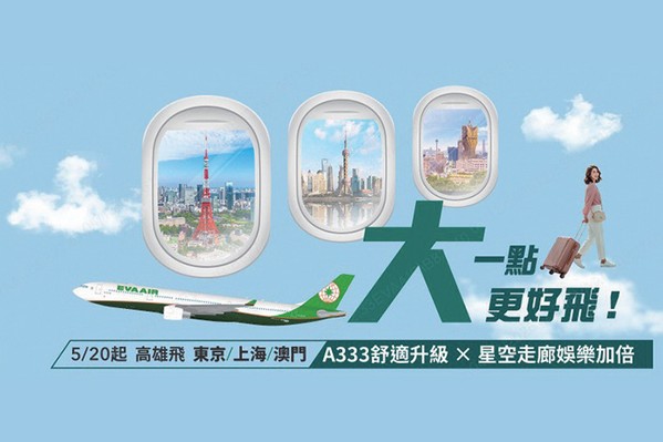 針對需求強勢成長的高雄市場,長榮不斷重兵布署,打造出飛航東京、大阪、福岡、首爾、上海、澳門、香港的飛航網絡,以每週56班的充足運能成為南台灣出遊的最佳選擇。為進一步滿足需求,長榮5/20起將派遣A330-300執飛東京、上海與澳門航線,客機配置桂冠艙及經濟艙,並搭載個人視聽娛樂設備,不僅升級飛行體驗;每班增加約125席,也能有效紓解旺季一票難求問題。