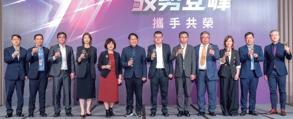 ▲可樂旅遊各部門代表敬酒致意。(左起)可樂旅遊東南亞部副總經理陳新格、日本部副總經理梁健隆、大陸部副總經理黃聖承、票商系統副總經理陳芝潁、董事總經理謝雲苗、副董事長吳守謙、董事總經理陳政宏、資訊系統總經理馬規倫、批售系統協理蕭光盛、韓國部副總經理萬麗香、歐洲部副總經理張瑛中、行銷系統副總經理林冠賢。