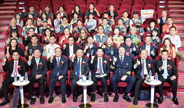 ▲(最前排左起)馬尼拉經濟文化辦事處高雄分處財務官游博皓、臺灣港務公司總經理王錦榮、董事長周永暉、麗星夢總裁吳明發、高雄市政府秘書長郭添貴、探索星號船長Christian Aalbers、麗星夢郵輪銷售聯盟會長暨台灣國際郵輪協會榮譽理事長吳勛豐、旅行行業全聯會理事長吳盈良;菲律賓觀光部台北分處處長梅顏寶(第2排左1)、麗星夢副總裁徐牧柔(第2排右1)與貴賓、高雄里長團合影。